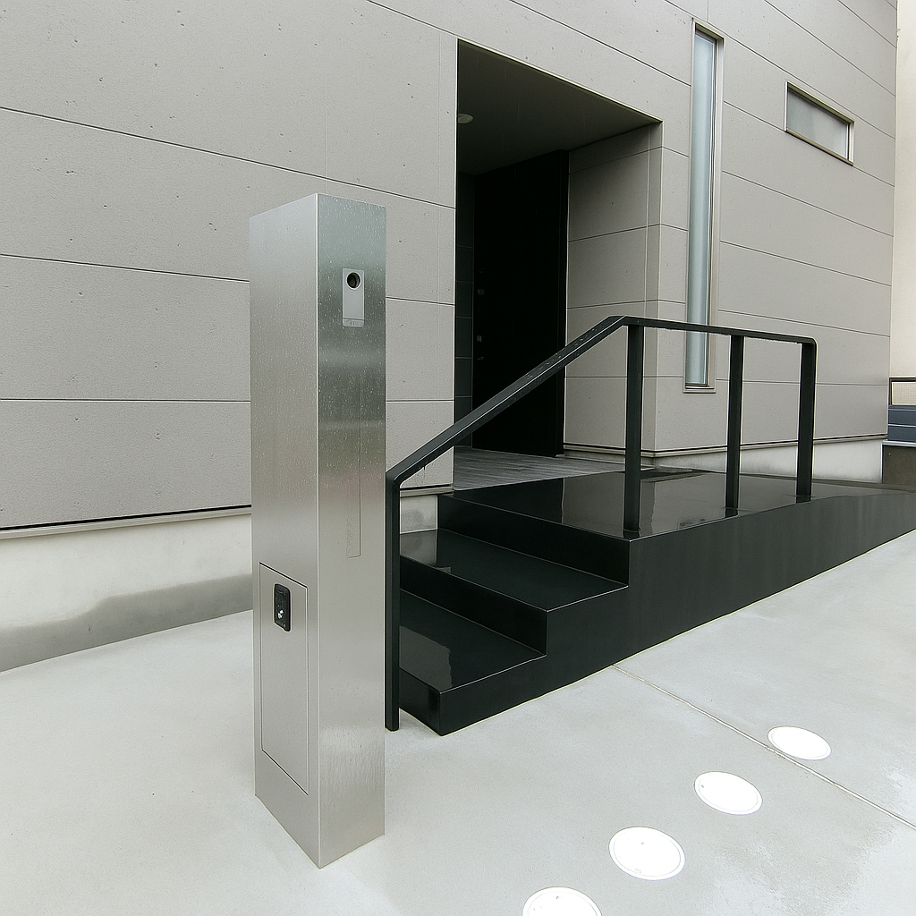 ステンレス製ポールと黒の階段がモダンな印象をつくる玄関前のアプローチ。LIXIL既製品手すり(デザイナーズレール)が美しく収まるように階段の高さを調整。角度調整ができない製品でも、うまく使えば美しく収まります。