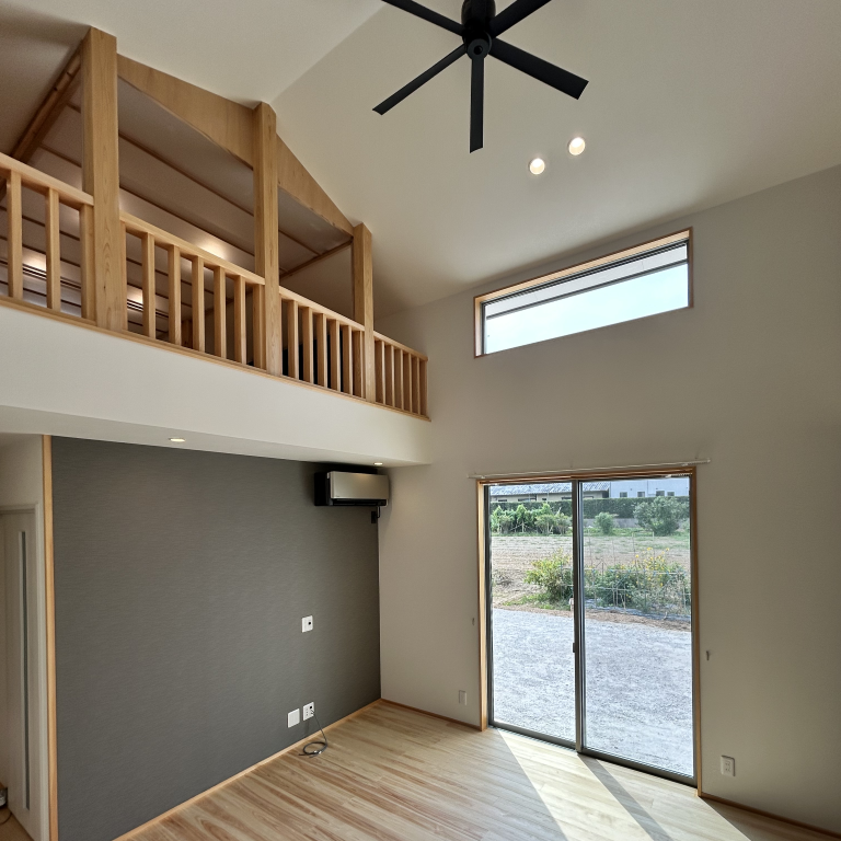 勾配天井と高窓からの豊かな採光が、室内を明るく開放的に彩るリビング空間。ロフトに用いた木材の肌理が温かみを添え、縦方向への伸びやかさを強調。外部の借景と調和し、住まう人に安らぎをもたらします。