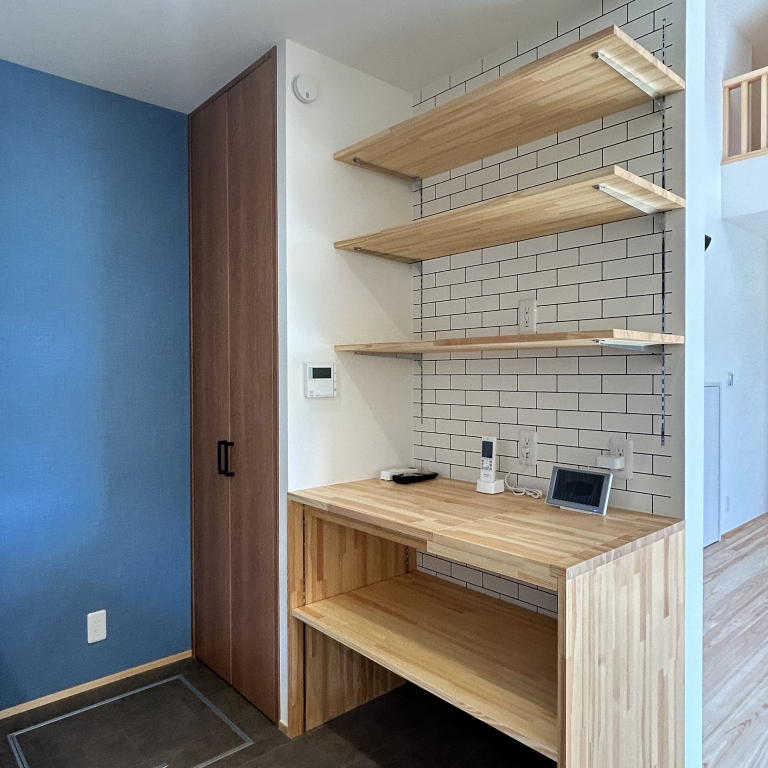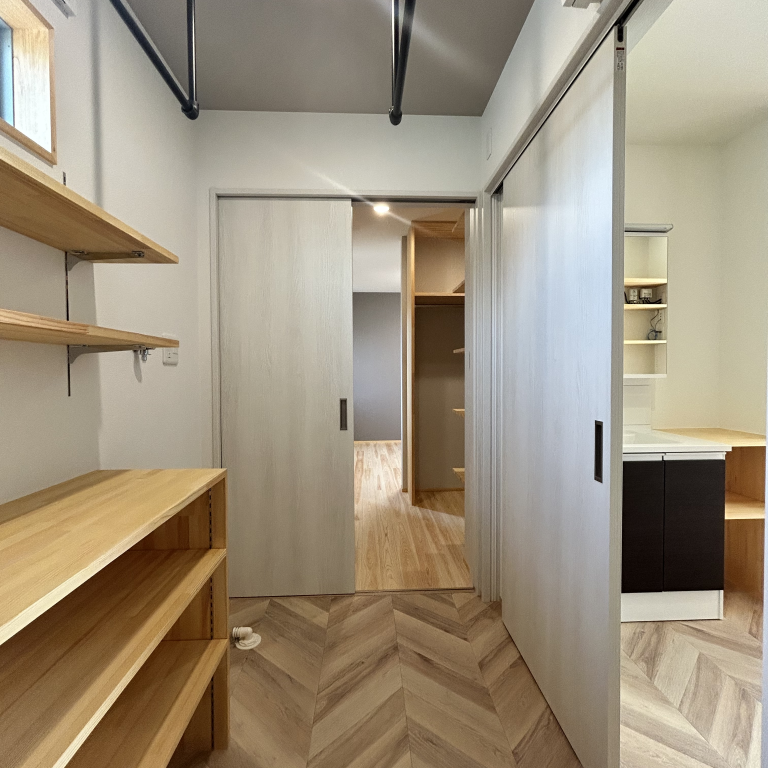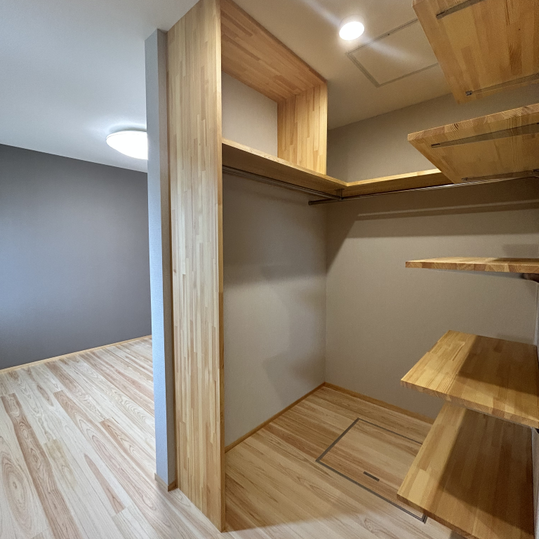 集成材の明るい木肌と落ち着いた壁面が調和し、心地よい温もりを醸し出す収納空間。可動棚とハンガーパイプが多様な収納計画を可能にし、床下収納も設置。寝室と脱衣所につながり家事動線にも配慮しています。