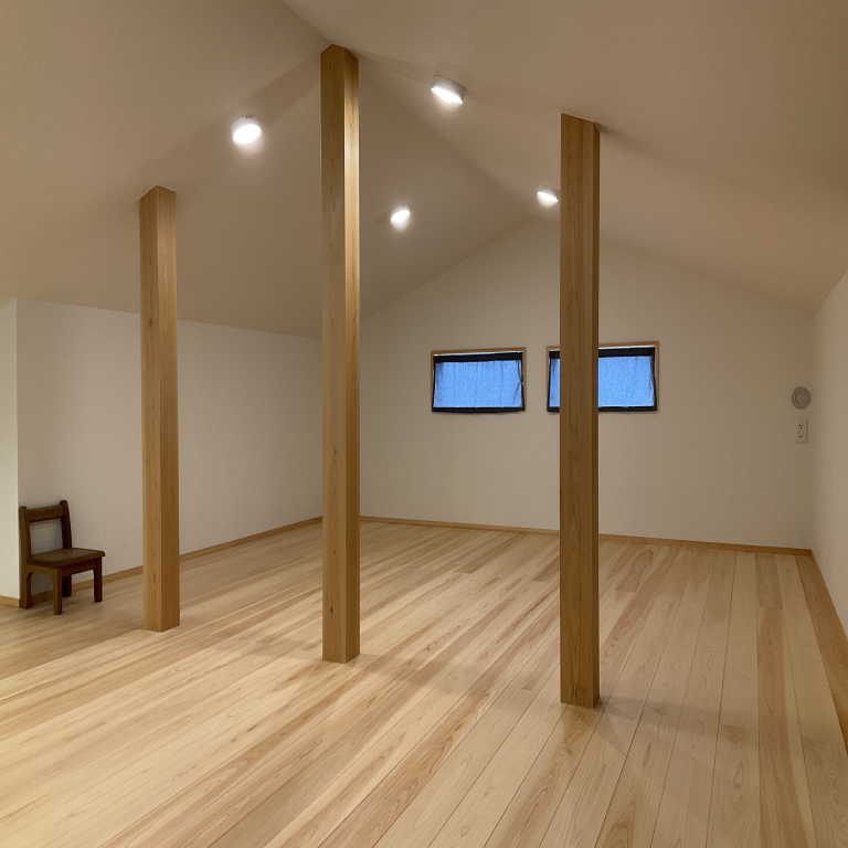 明るい色合いの桧無垢フローリングと現しの木製柱・梁が調和し、温もりを感じるロフト。大容量収納として、子供の遊び場として大活躍する大空間。