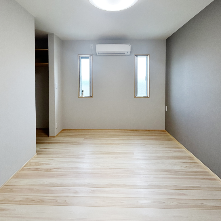 淡色の壁とコントラストをなすアクセントウォールが空間に深みを与えます。二連窓から入る控えめな採光は良質な睡眠を邪魔せず、奥のウォークインクローゼットは隣の脱衣所へとなめらかに続き、生活動線にも配慮された空間です。