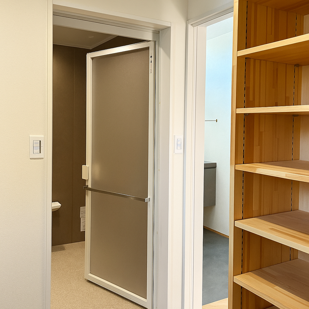 収納と水まわりを隣接させた、使いやすい家事動線の空間。