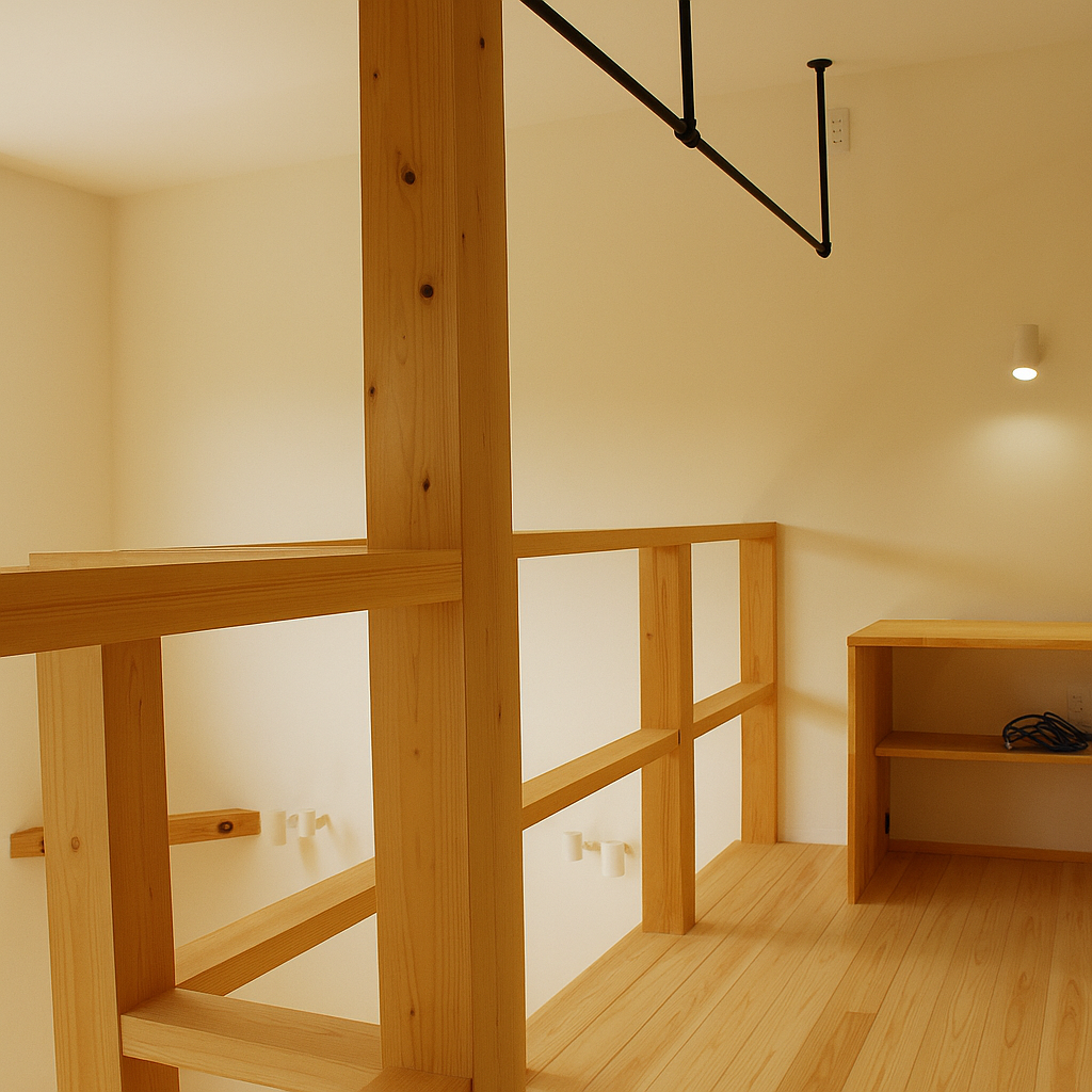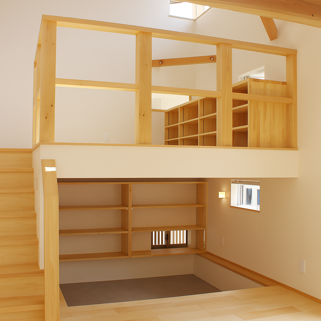 吹き抜けや中二階、掘り下げ空間を組み合わせ、上下の動線を豊かにデザイン。家族の気配を感じながらも、距離感を保てる立体的な暮らし。光と木の素材が一体となり、開放感と温もりを両立した住まいです。