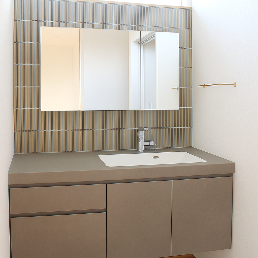グレートーンでまとめた、タイルと照明が映える洗面台。