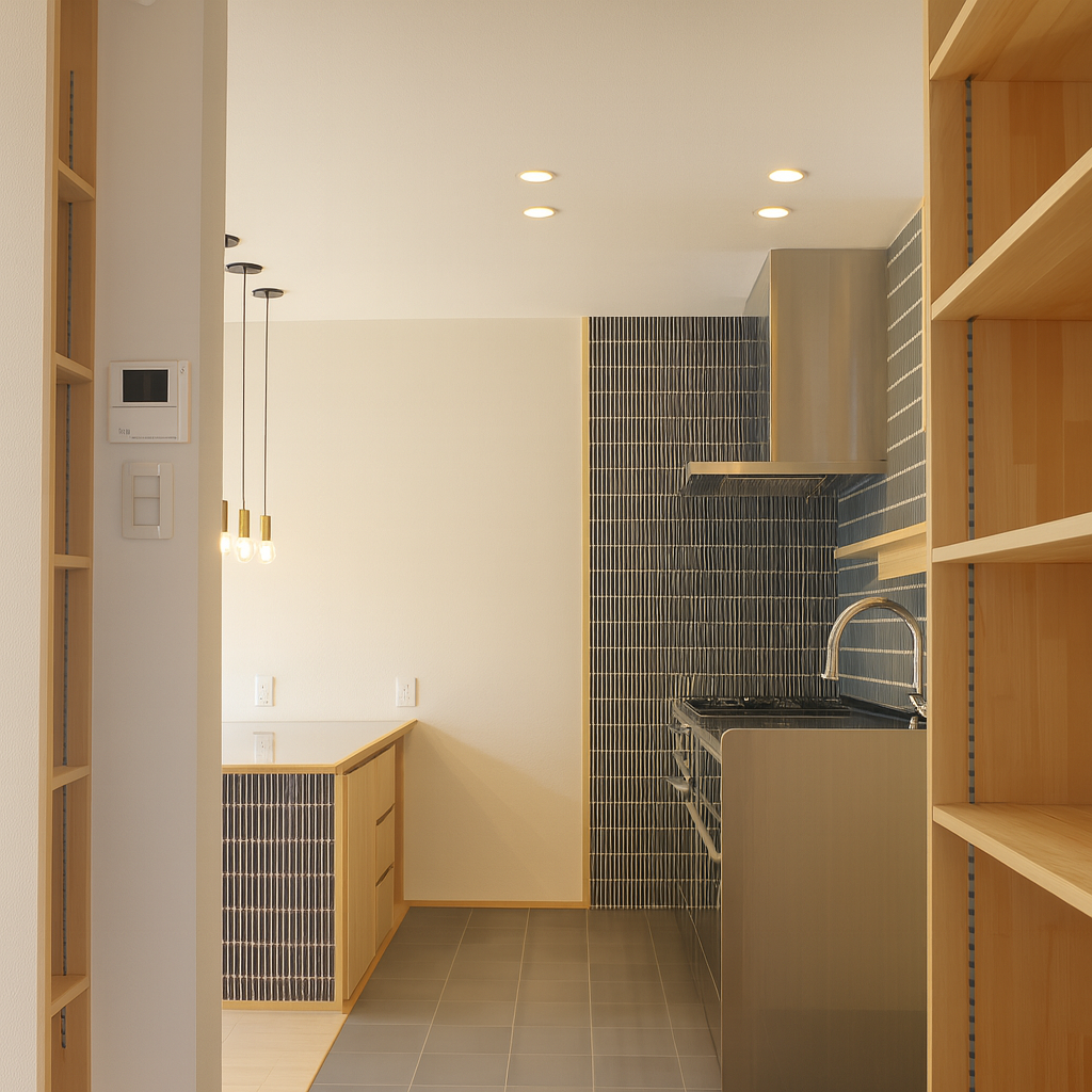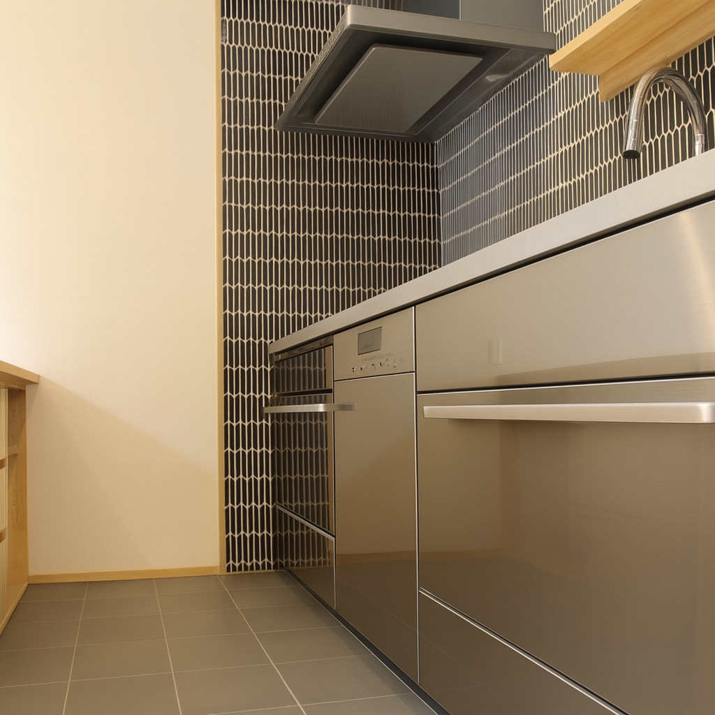 艶のあるステンレスと黒タイルが調和する、上質で落ち着いたキッチン空間。