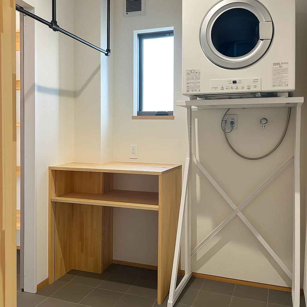 造作棚と乾太くんを備えた、家事動線を意識した脱衣空間。