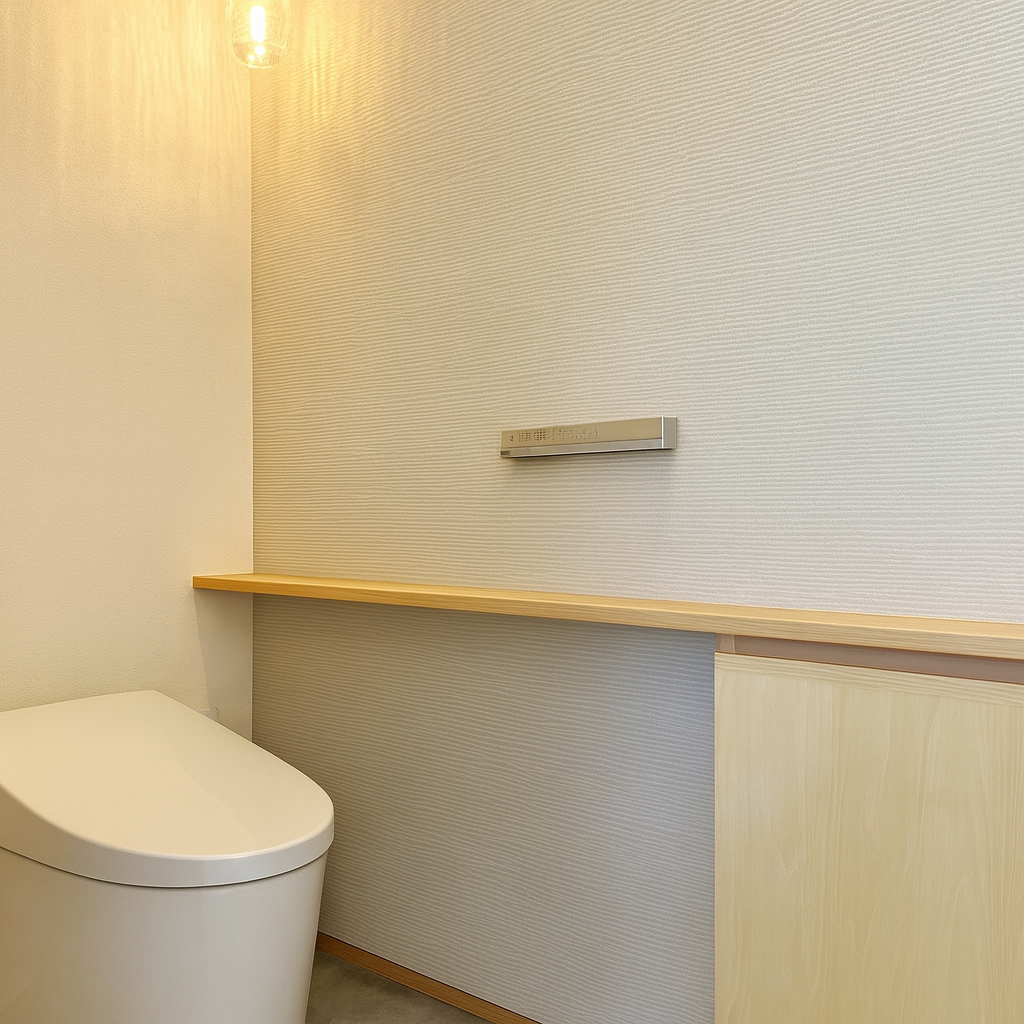 柔らかな灯りと木の質感が調和した、落ち着きのあるトイレ空間。