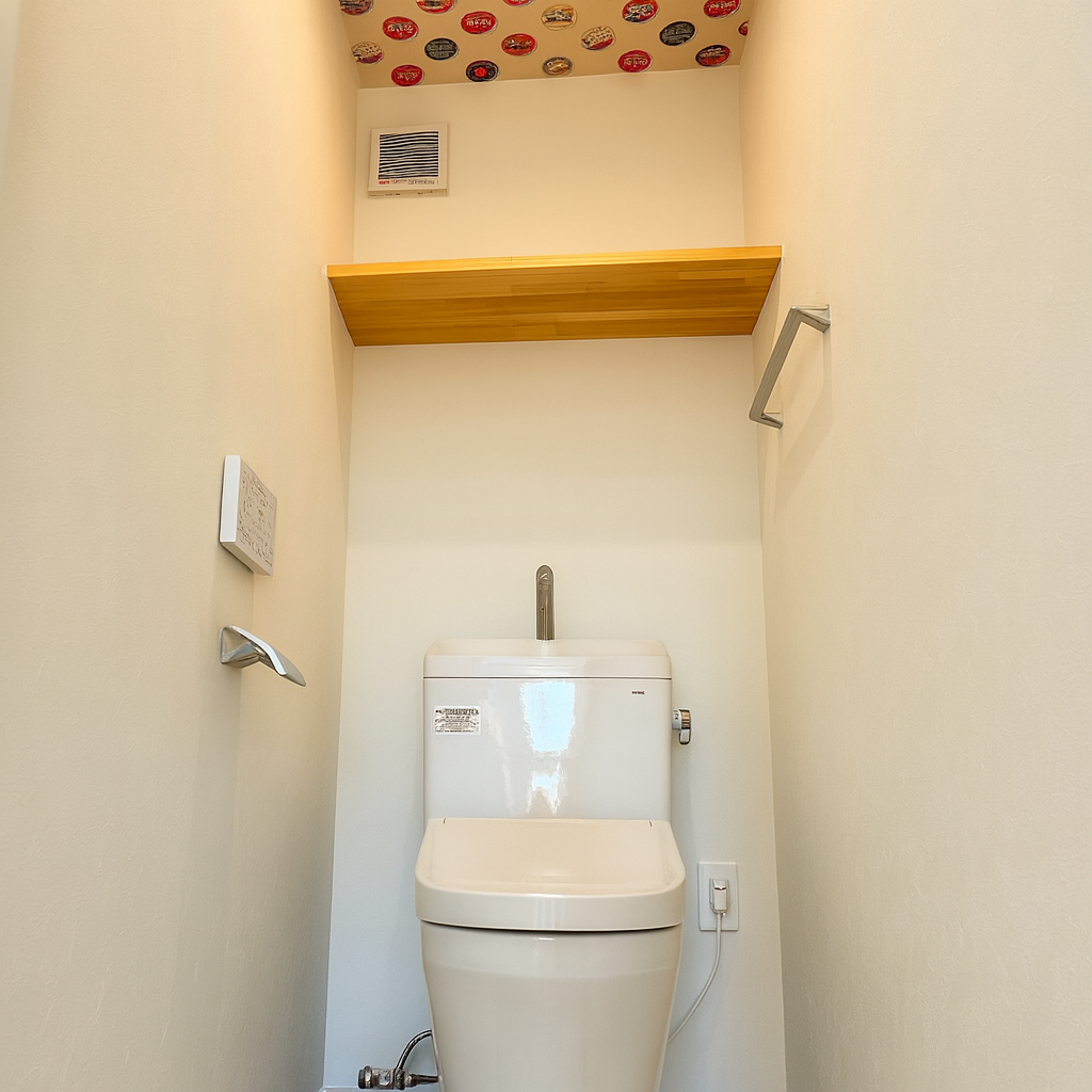 天井のアクセントクロスが楽しい、清潔感と遊び心を併せ持つトイレ空間。