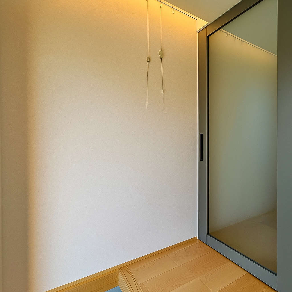 柔らかな間接照明が壁を照らす、静けさの中に温もりを感じる玄関。