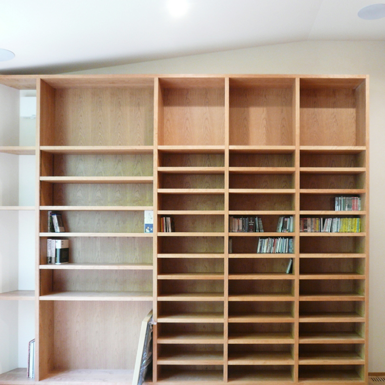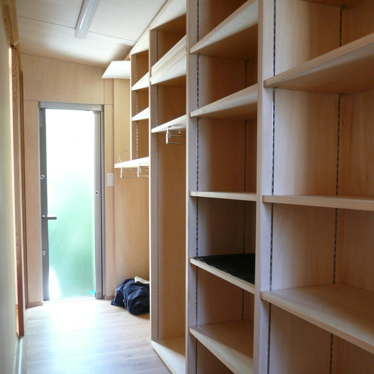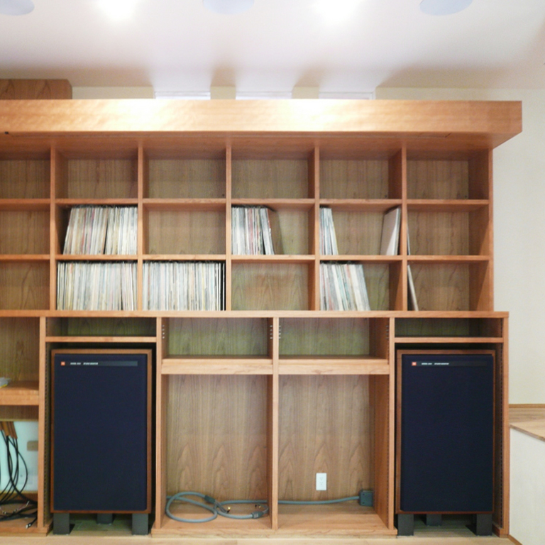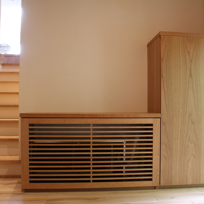 明るい木材で統一された機能的な空間。ルーバー扉の造作収納は、内部送風機器の機能を妨げず生活感を隠し、階段下のデッドスペースを有効活用。隣接する収納と一体感を持たせ、すっきりとした印象に。