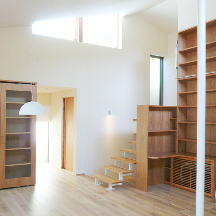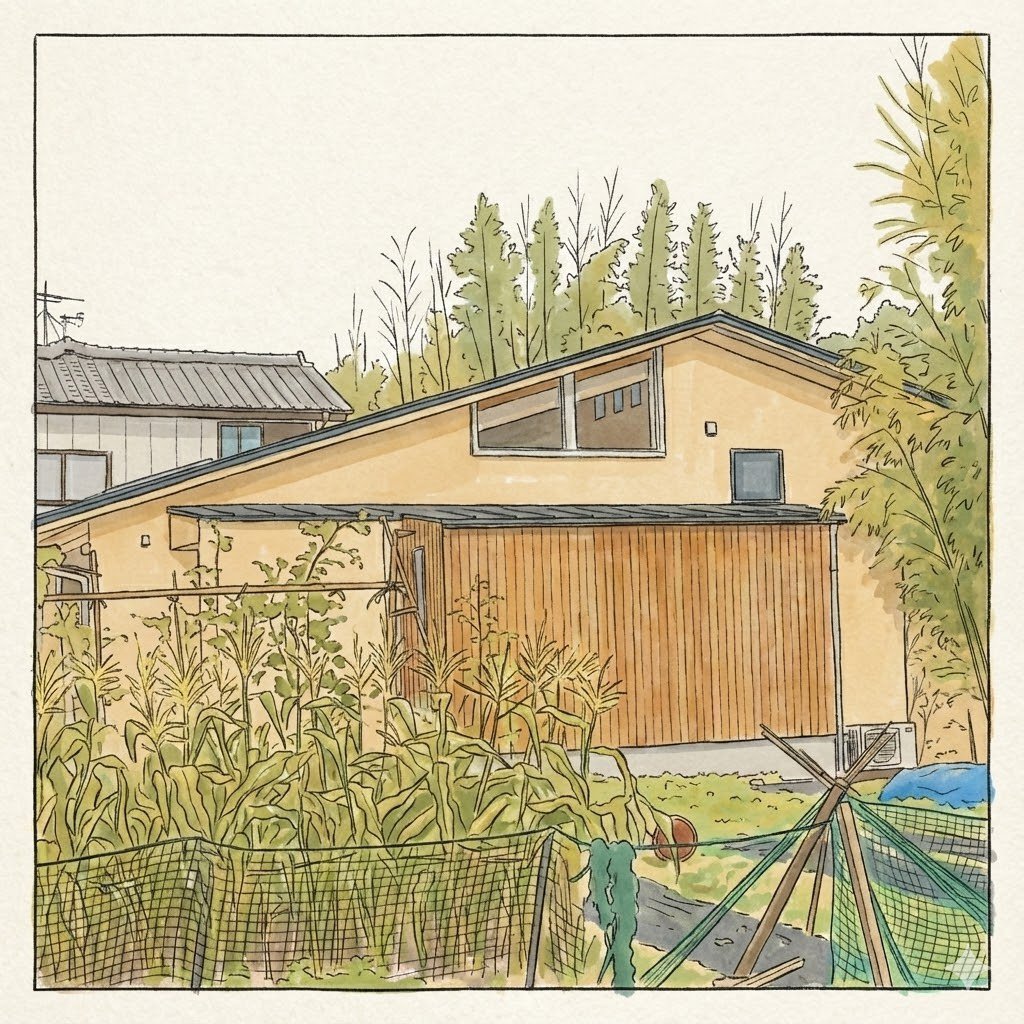 勾配屋根と木製サイディングの組み合わせが特徴的なモダン外観です。明るい陽光が降り注ぐ中、畑の緑が暮らしに彩りを添えます。傾斜天井に配された窓は、上質な光と風を室内へ届け、自然と共生する穏やかな生活を叶えます。