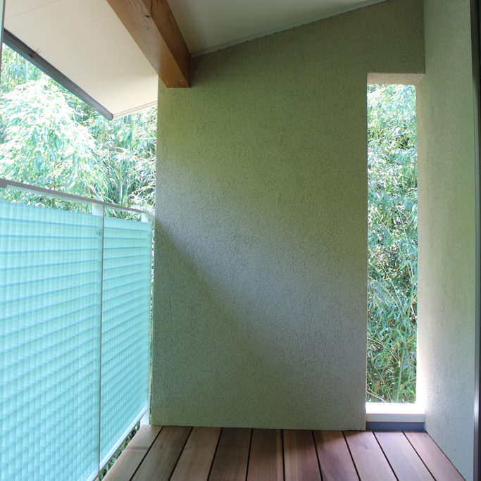 周囲の緑と調和するウッドデッキのベランダは、プライバシーを守るルーバー越しに心地よい光と風を招き入れます。壁の開口部からも豊かな自然を感じられ、心安らぐひとときを演出。自然素材の温もりと緑に包まれ、日常に癒しをもたらす外部空間です。