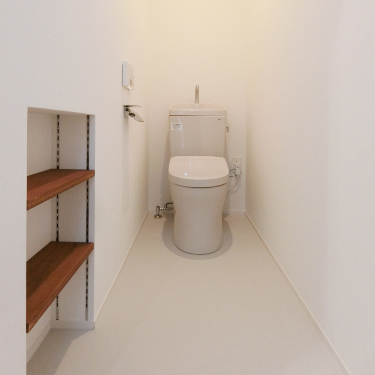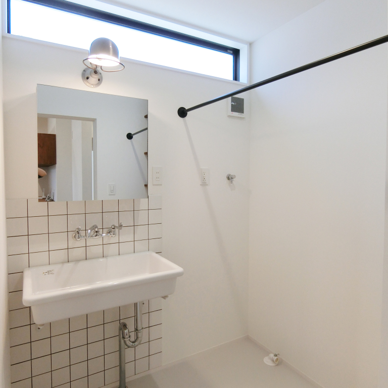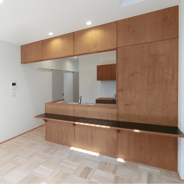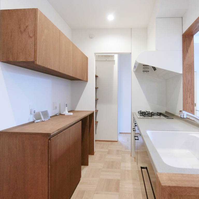 キッチンと並列する造作収納カウンターは、素朴な素地を持つラワン合板製。白壁と調和し、均質な採光が清潔感と機能美を際立たせる。奥のパントリー、玄関ホールへと続き家事動線にも配慮されている。