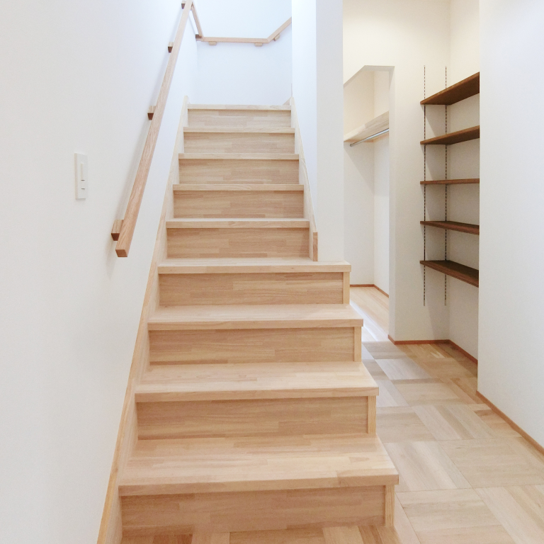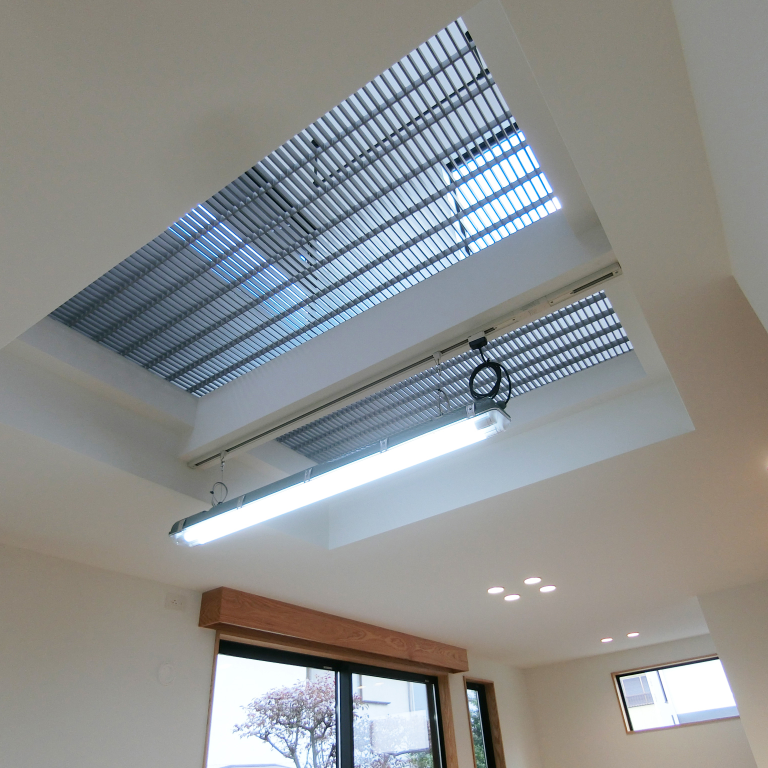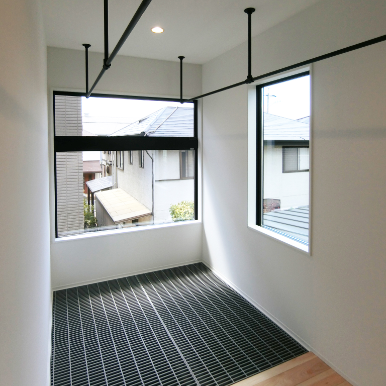 31坪の2階建て。LD上部の一部にグレーチングを採用し、2階からの光が降り注ぐ明るい住まいを実現しました。床材には懐かしさを感じるスクールパーケット、造作家具には味わい深いラワン合板を用い、既製品にはない素材感が息づく個性豊かな空間に仕上げています。