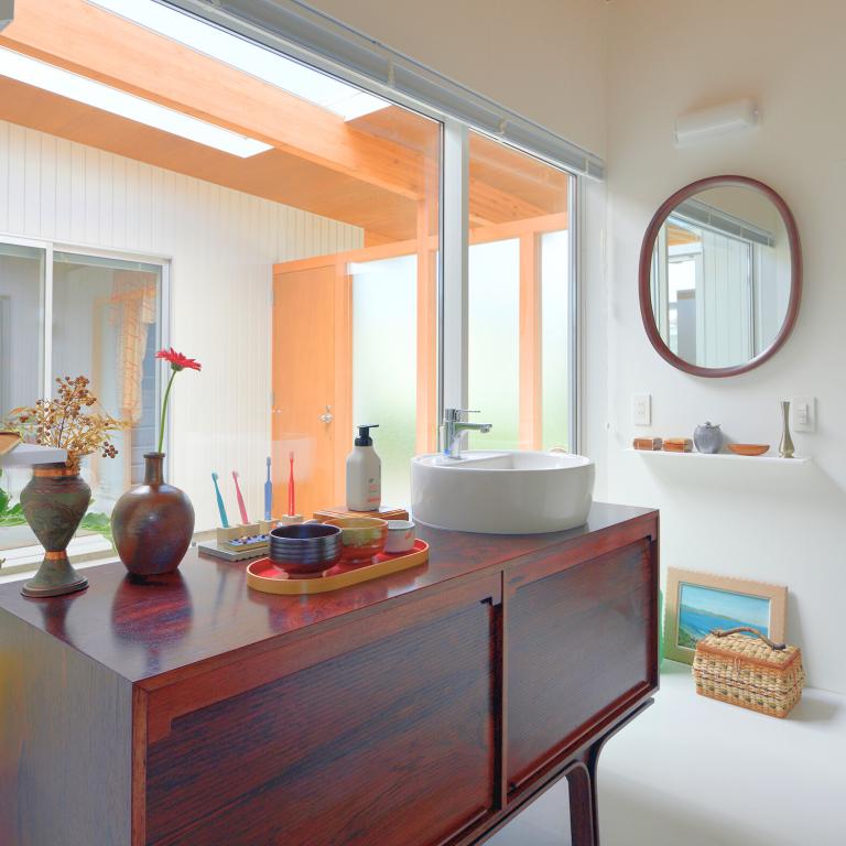 お施主様夫婦が長年抱き続けた、アメリカの名作住宅「アイクラホーム」への強い憧れ。その純粋な想いに彦坂設計が深く共鳴し、一つの形へと昇華させた邸宅です。ミッドセンチュリーの傑作が提示した「開放感とプライバシーの両立」という理想を、日本の気候と暮らしの中で再解釈。力強く伸びる梁やリズムを刻む高窓に、施主の情熱と設計士の視点、そして萩森建設の精緻な技術が重なりました。単なる模倣ではない、住まう人の魂が宿る一軒です。