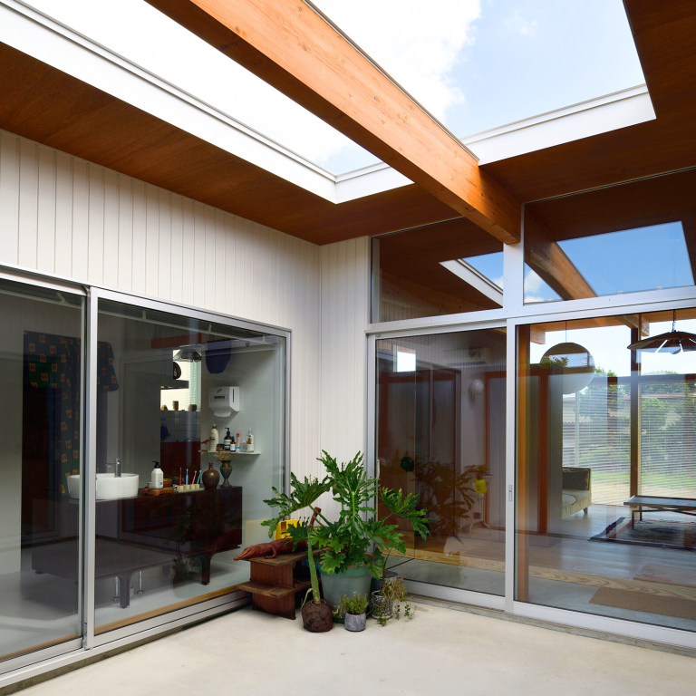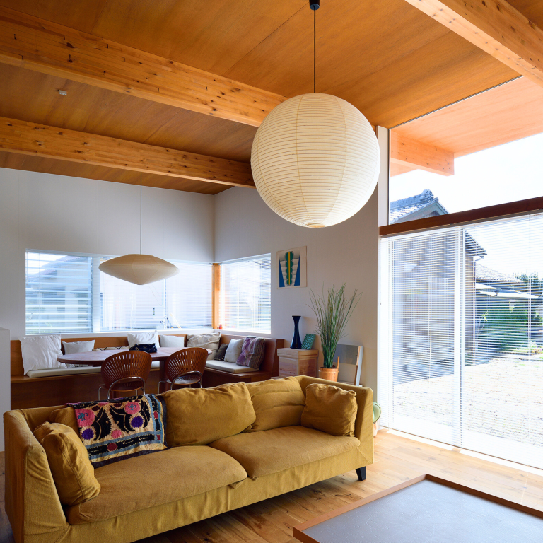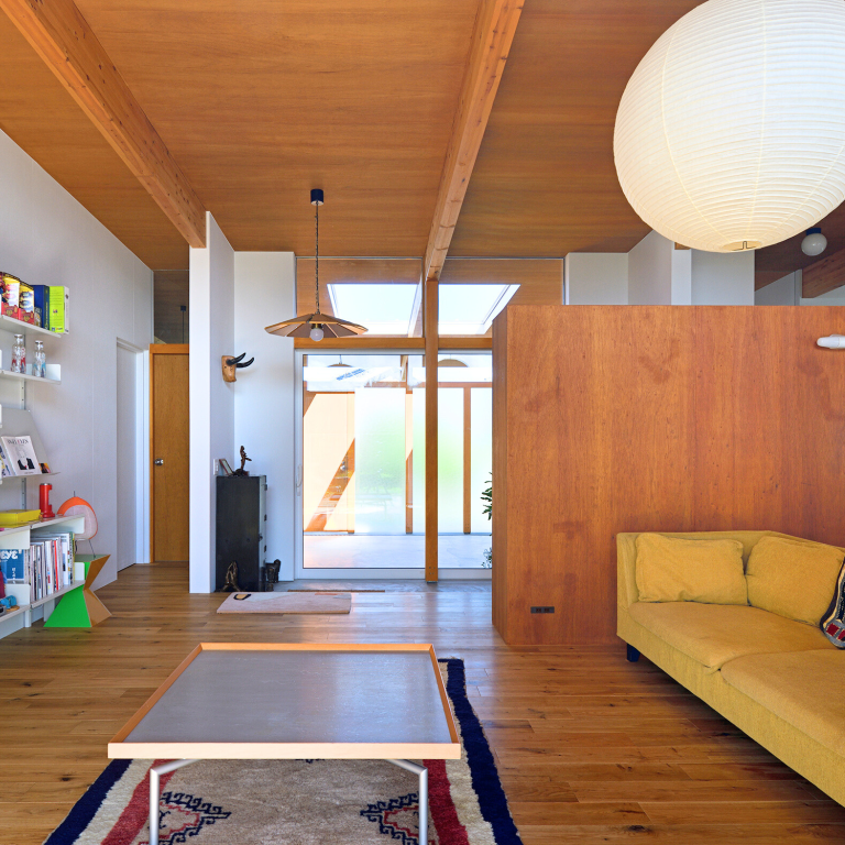 中庭を囲む大開口が、空間に多角的な光を招き入れます。木質天井の温もりと白い壁の対比が、素材の肌理(きめ)を際立たせ、内外の視線が心地よく連続する、静謐な住まいです。