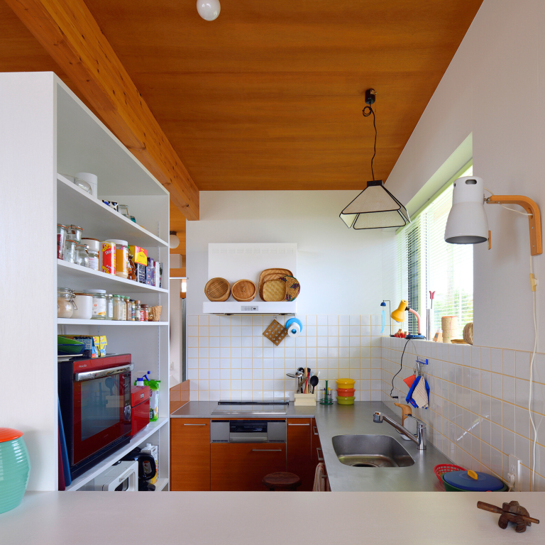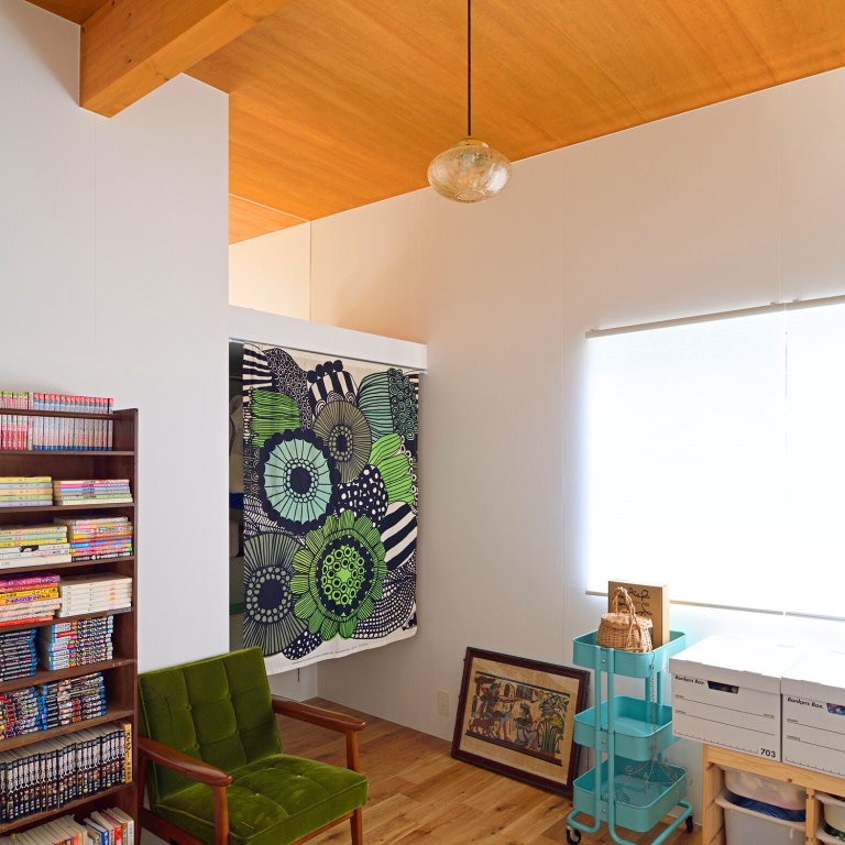 隣室との境の壁を一部高窓にしたことで、奥行きと変化をもたらし、柔らかな採光が白壁と木質天井のコントラストを際立たせる。お気に入りの家具や趣味の品物が品よく映える空間。