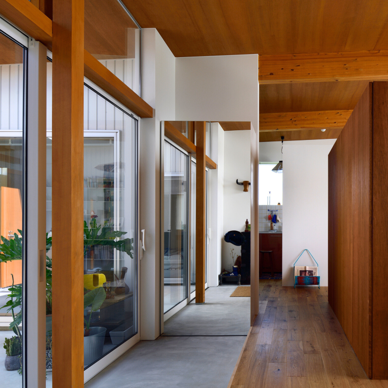 連続する開口部から豊かな採光が室内に深く導かれ、木材の温もりとモルタルの無機質さが深みのある対比を生む。素材の肌理(きめ)が織りなす陰影が、内外の境界を曖昧にする設(しつら)え。