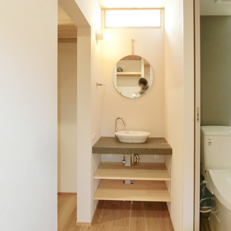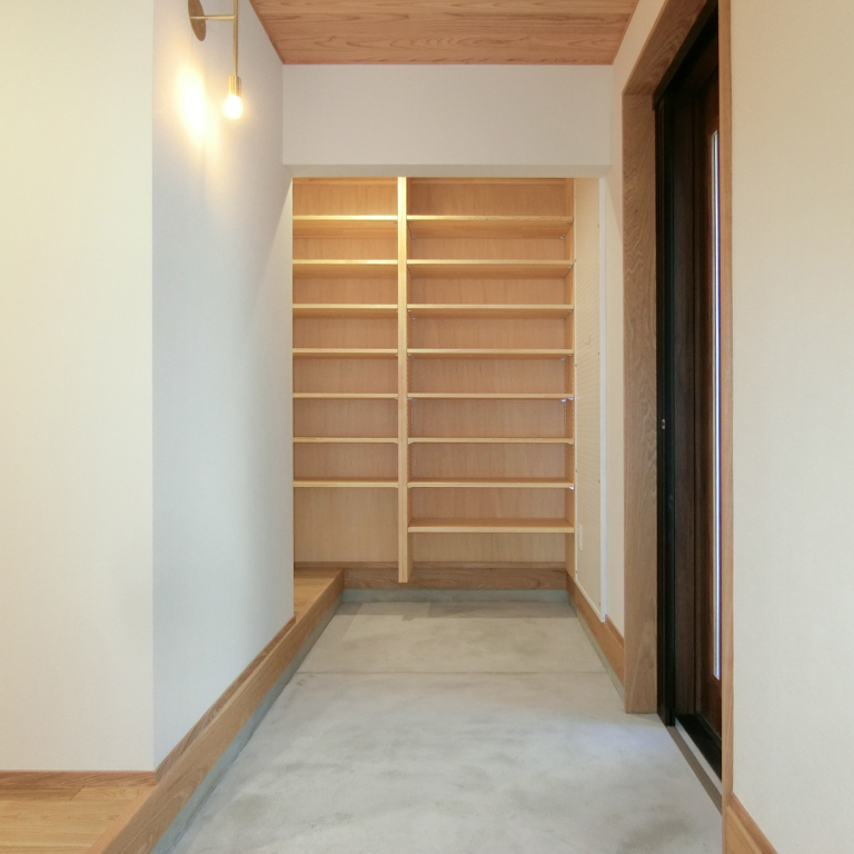 土間コンクリートと温かな木材が調和する玄関。真鍮のウォールライトが壁に優しい光を落とし、心地よい雰囲気を演出します。玄関から奥の造作棚へと続く動線は、素材の対比と機能美が光る、使い勝手の良い空間です。