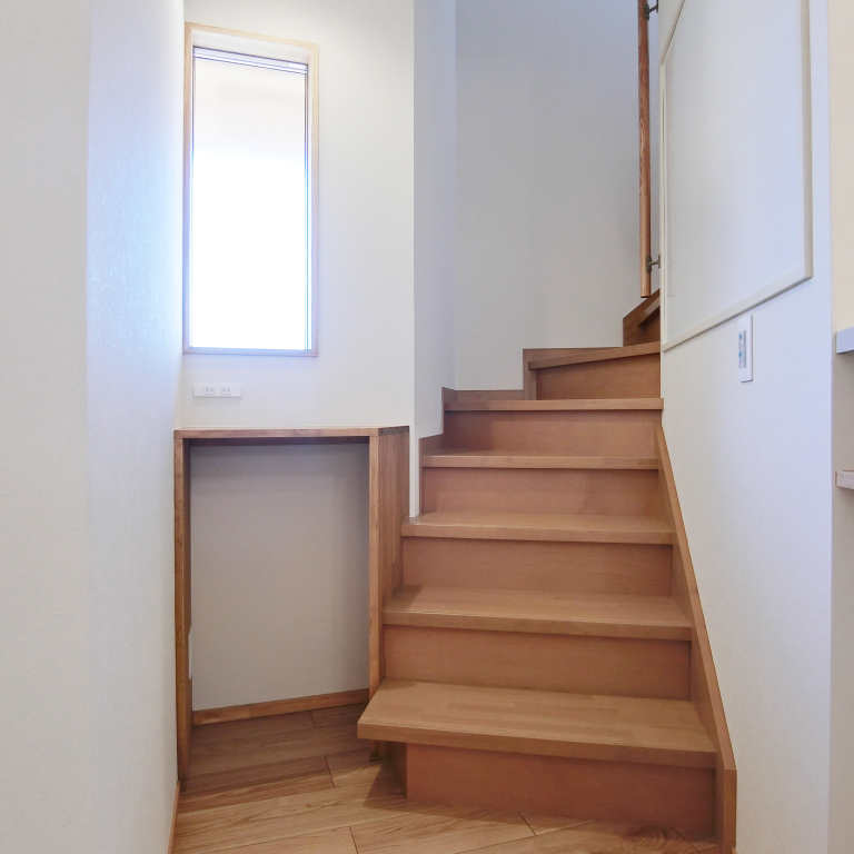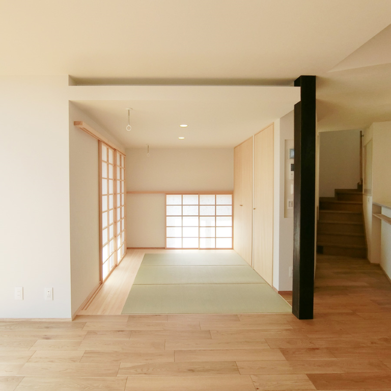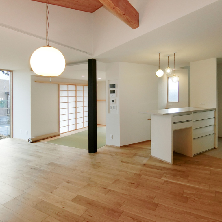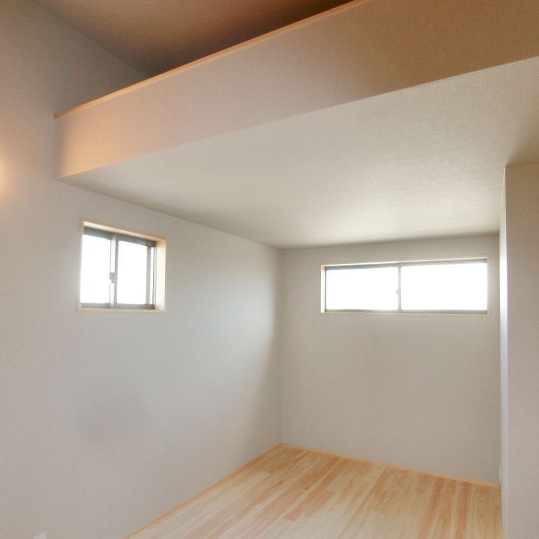 明るい木目フローリングと白壁で統一され、清潔感と開放感のある寝室。二面の窓から豊かな自然光が降り注ぎ、室内全体を明るく照らします。天井の一部を屋根裏にすることで高さに変化をつけ、収納性も高めました。