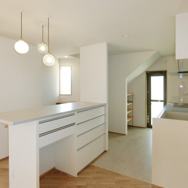 三角形の敷地に合わせた『くの字』のプランが、個性的な外観と、斜めに視線が抜ける開放的なLDKを描き出した33坪の2階建て。変形地特有のコーナーも余さず収納として活用し、高いデザイン性と暮らしやすさを両立させています。