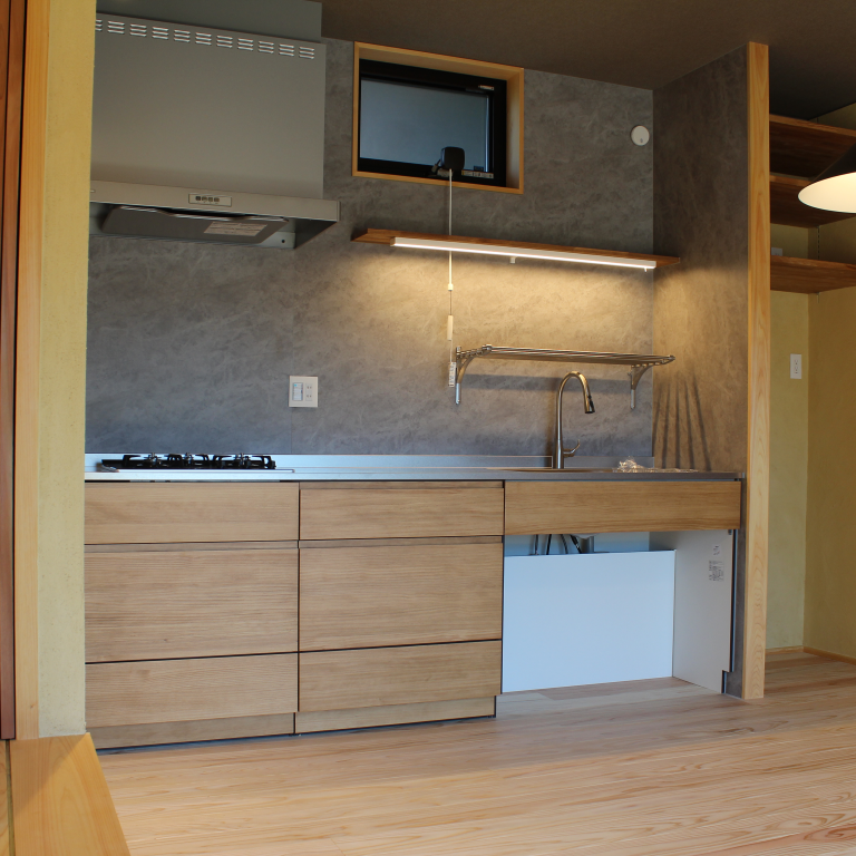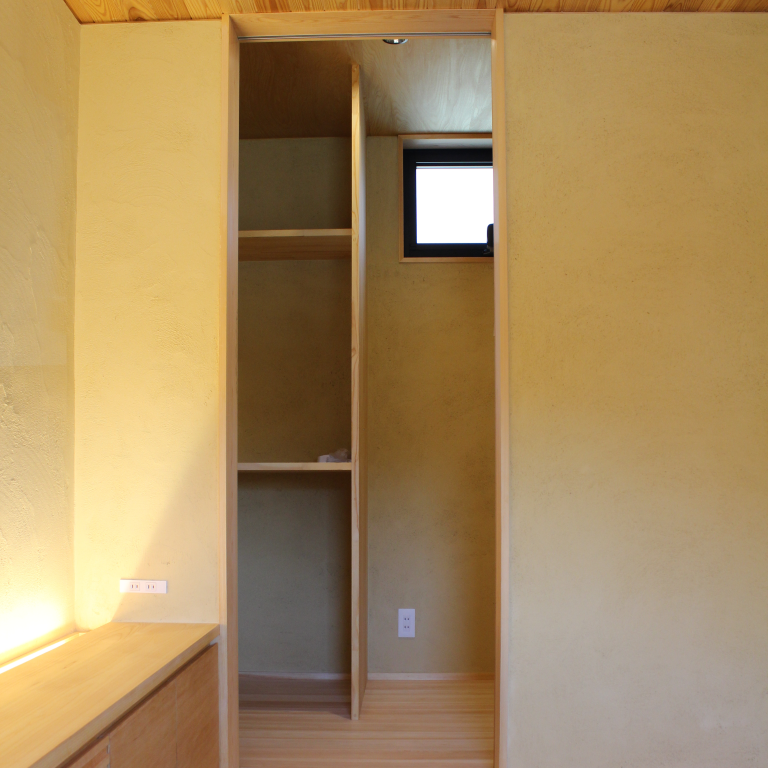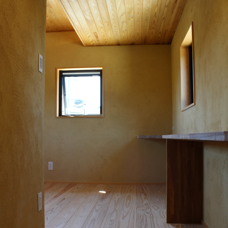木材の天井と土壁が織りなす空間は、自然素材の調湿性で心地よさを保ちます。大小二つの窓から差し込む光が穏やかな雰囲気を作り出し、造作カウンターは読書や作業に最適。心安らぐプライベートな時間を提供します。
