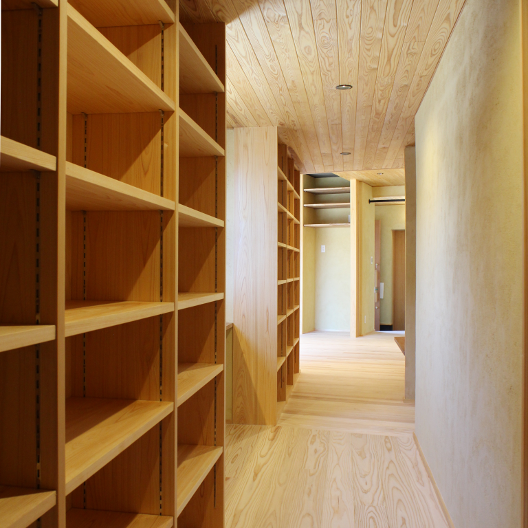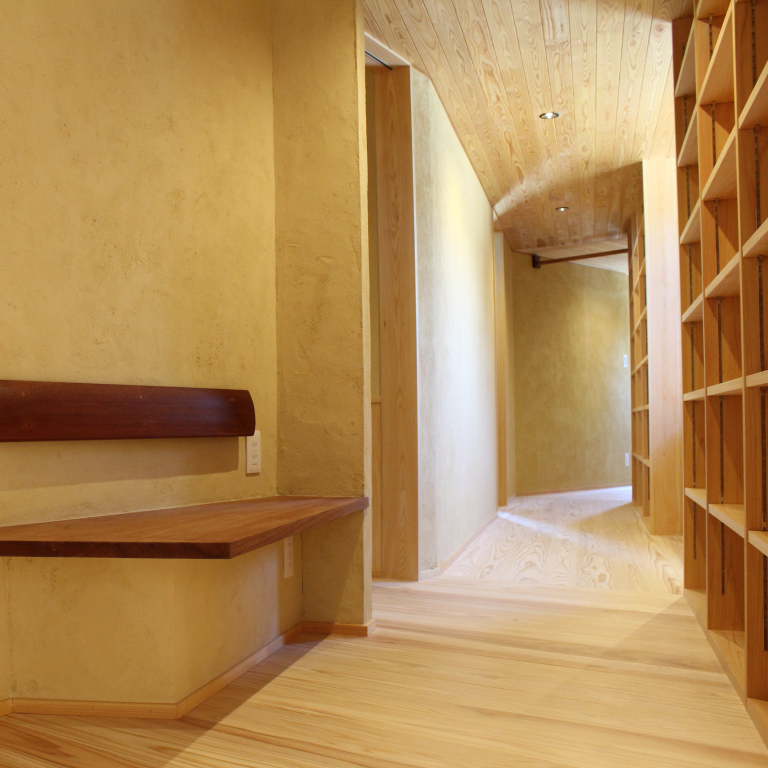 明るい木材と土壁が調和する廊下空間。壁一面の造作棚は大容量収納を確保し、窓下のカウンターデスクは作業スペースに。自然光と温かい照明が心地よく、多目的に使える動線上の機能的な一角です。