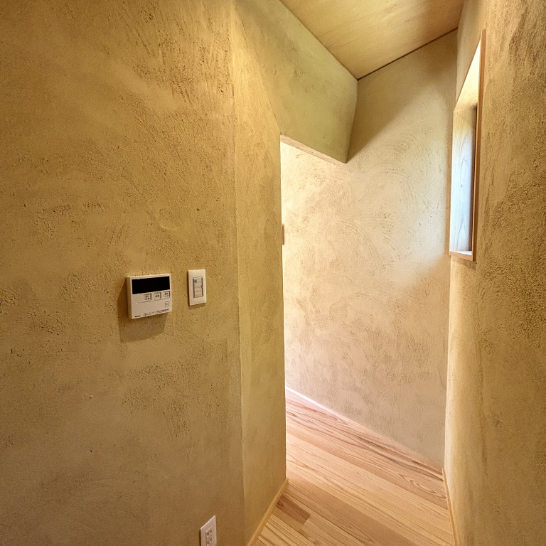土壁調の塗り壁と無垢材フローリングが調和する廊下。自然素材特有の調湿性で快適な室内環境を保ちます。奥の小窓から柔らかな光が差し込み、日中の明るさを確保。住まいの中心を通る動線に、素朴で温かい安らぎを与えます。
