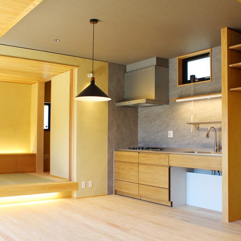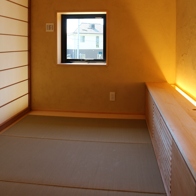 土壁と畳が落ち着きを醸す和室。窓からの採光と、造作カウンター上の間接照明が壁に温かい陰影を落とします。ルーバー扉の収納はベンチとしても活用でき、機能的。自然素材が調湿し、多目的に心地よく過ごせる空間です。