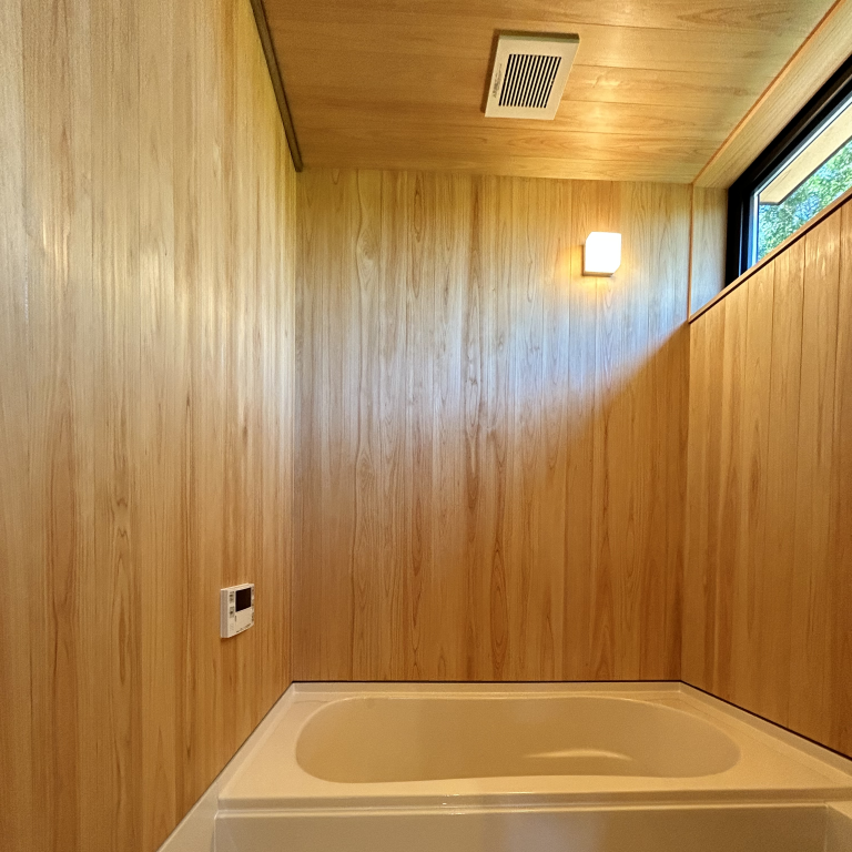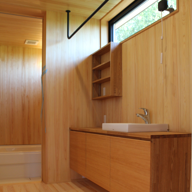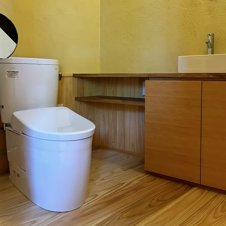 木の温もりと左官壁の表情が調和したトイレ。節水型便器と埋め込み手洗い器をコンパクトに配置し、毎日の動線をスムーズに。小物収納も備え、清潔で明るい空間を維持します。