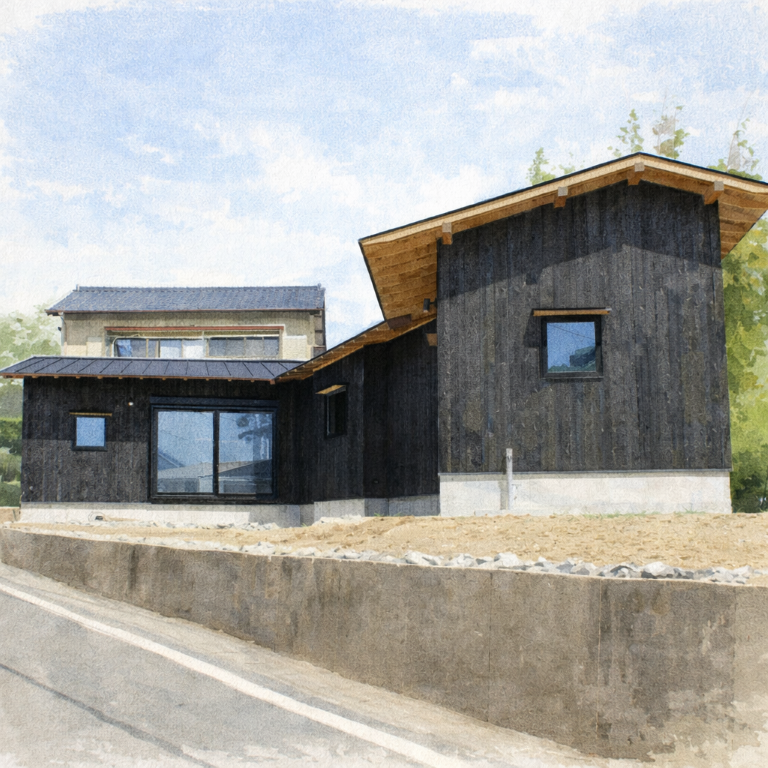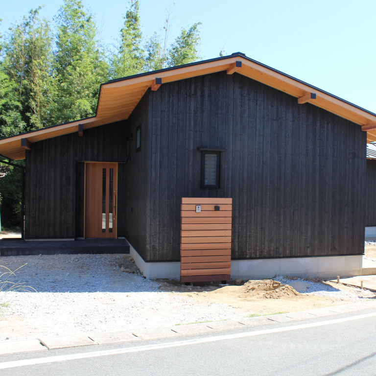 黒い木質外壁が周囲の緑に映える現代的なデザイン。特徴的な片流れ風切妻屋根と軒の木材が温かみを添え、シャープな印象の中にも落ち着きを感じさせる。計算された窓の配置が、採光とプライバシーを両立し、豊かな生活空間を創造します。
