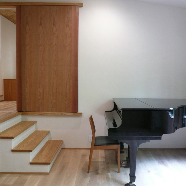 木の温もりを感じる空間に、グランドピアノが美しく映えます。存在感のある木製引き戸は、空間を柔軟に仕切り、音の響きにも配慮。明るい木材の階段とフローリングが統一感を出し、開放的な雰囲気を演出。音楽を日常に取り込む豊かな生活を提案します。