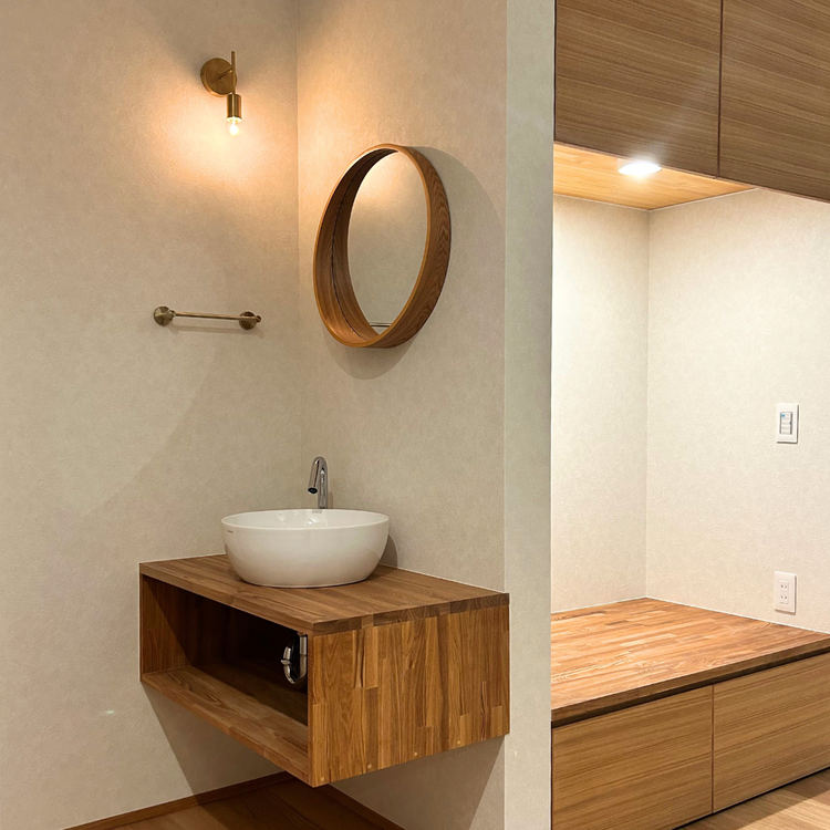 大開口からの豊かな採光が、明るい木肌の桧フローリングを照らし、空間に軽やかさをもたらす。吹き抜けとアイアン手すりが視線の抜けを生み出し、外部の緑と呼応。機能性と意匠が融和した、伸びやかな2階ホール空間です。