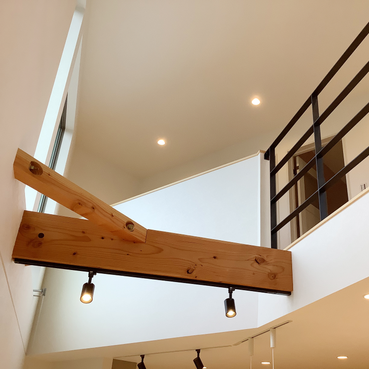 高窓から差し込む自然光が、吹き抜け空間の開放感を高める。力強い木組みの架構が意匠として映え、黒いアイアン手すりが現代的な印象を添える。