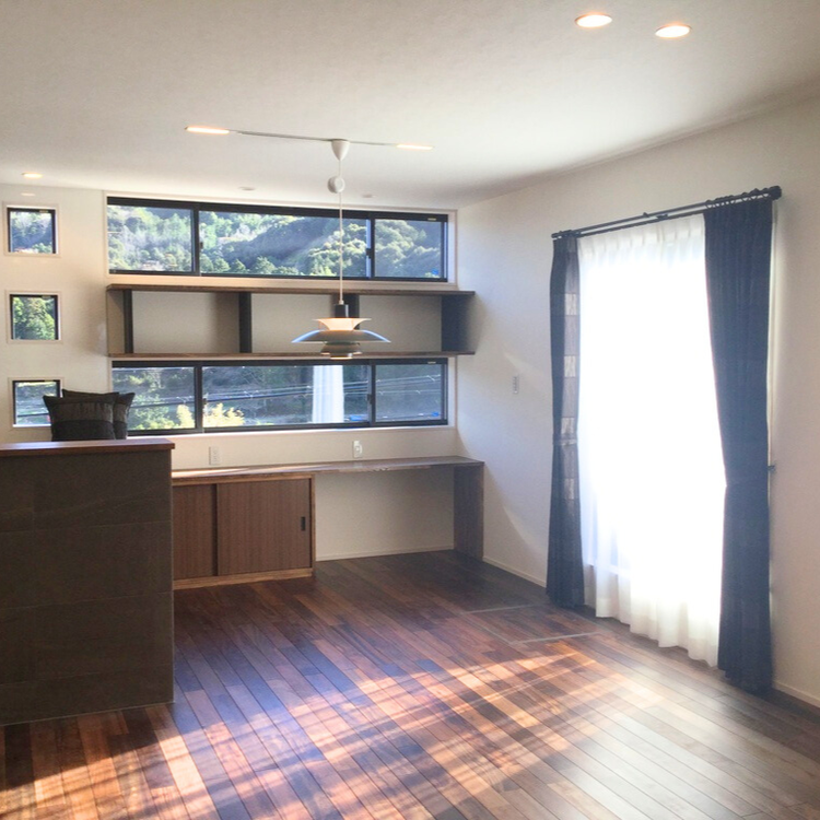 落ち着いたブラックウォールナットの床材を採用。二連の横窓は、周囲の山々の風景をまるで絵画のように美しく室内に取り込みます。