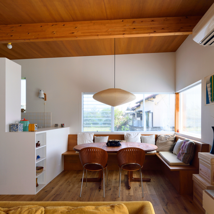 勾配天井の木材と白壁が織りなす、開放感と落ち着きを兼ね備えたLDK。部屋の角を活かした大きな窓と造作ベンチが機能的で明るい空間を創り出し、家族の対話を育む上質な団欒の場となっています。