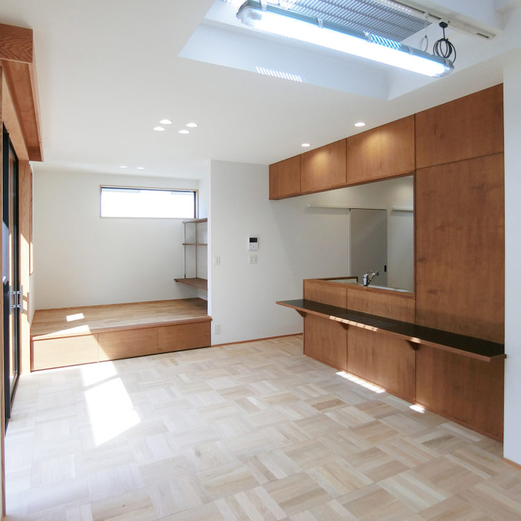 複数の採光計画により、明るさと開放感に満ちたリビング。スクールパーケットの床材が軽やかなリズムを刻み、造作収納の木肌の温もりが随所に息づく。奥に小上がりの畳部屋が続き、空間に多様な機能と落ち着きをもたらす。