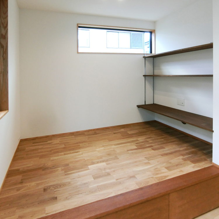 横長窓から自然光が入る小上りの空間は、可動棚も設置され、多目的に使えるスペース。段差部にを引出収納にすることで収納力を高めました。