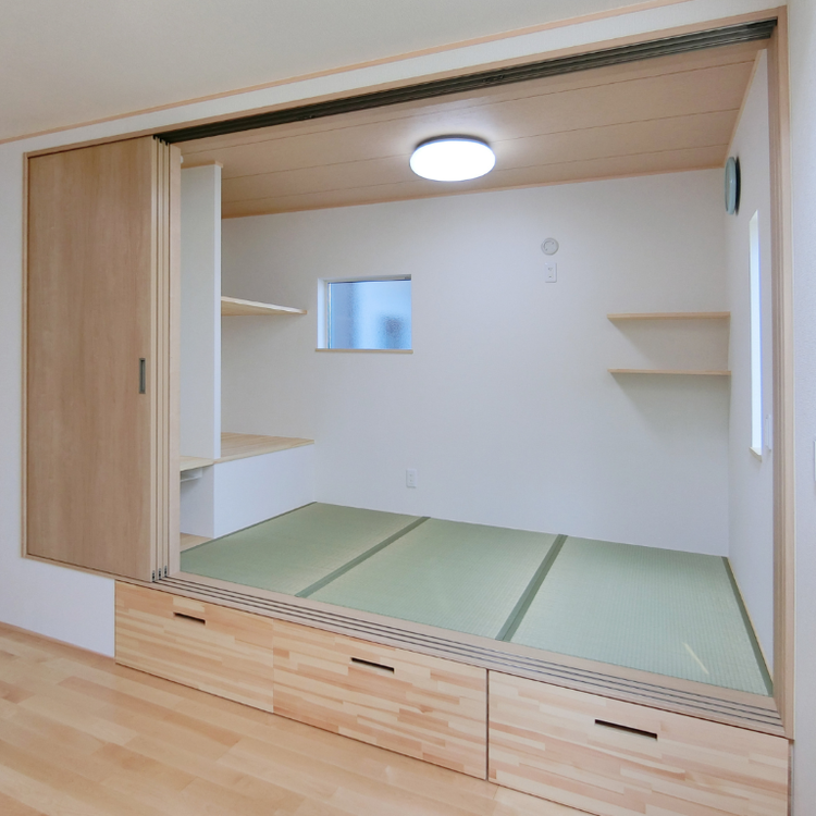 リビング横の小上がり和室。大容量収納と造作棚で機能性を高め、日中は家族の憩いの場、夜は夫婦の寝室としてマルチに活躍する空間。