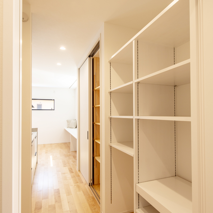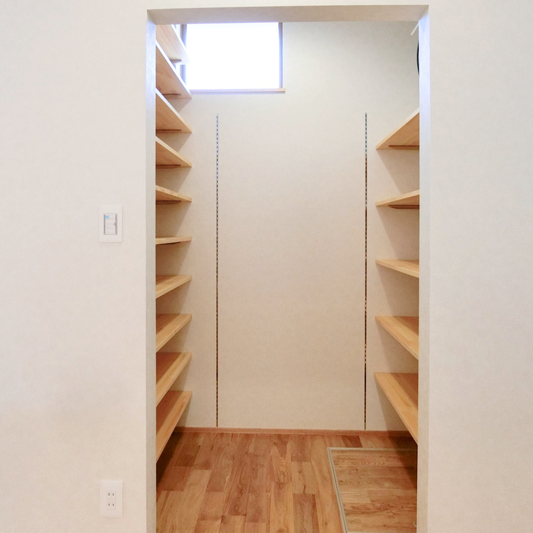 ストック食材や調理機をすっきりと収納できる便利なパントリー。高い位置の小窓から自然光が入り、日中は照明なしでも見やすく取り出しやすい設計です。奥の壁面にも棚を追加設置でき、将来収納物が増えても安心です。