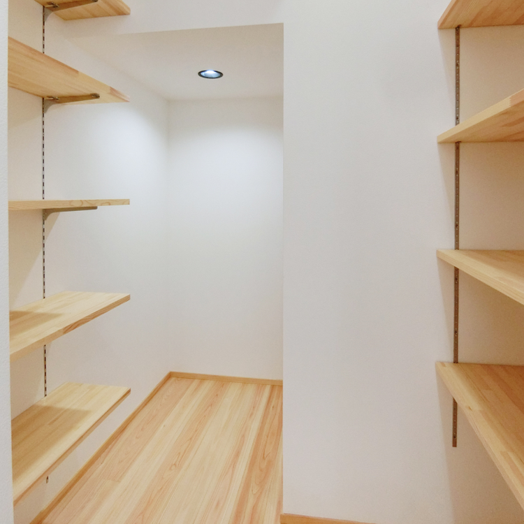 明るい木目(桧)の床と可動棚が特徴の収納空間。清潔感ある白壁とダウンライトが、様々な物を整理しやすく、明るい雰囲気を作り出します。食品ストックから日用品まで、暮らしに合わせてフレキシブルに使える多機能なスペースです。