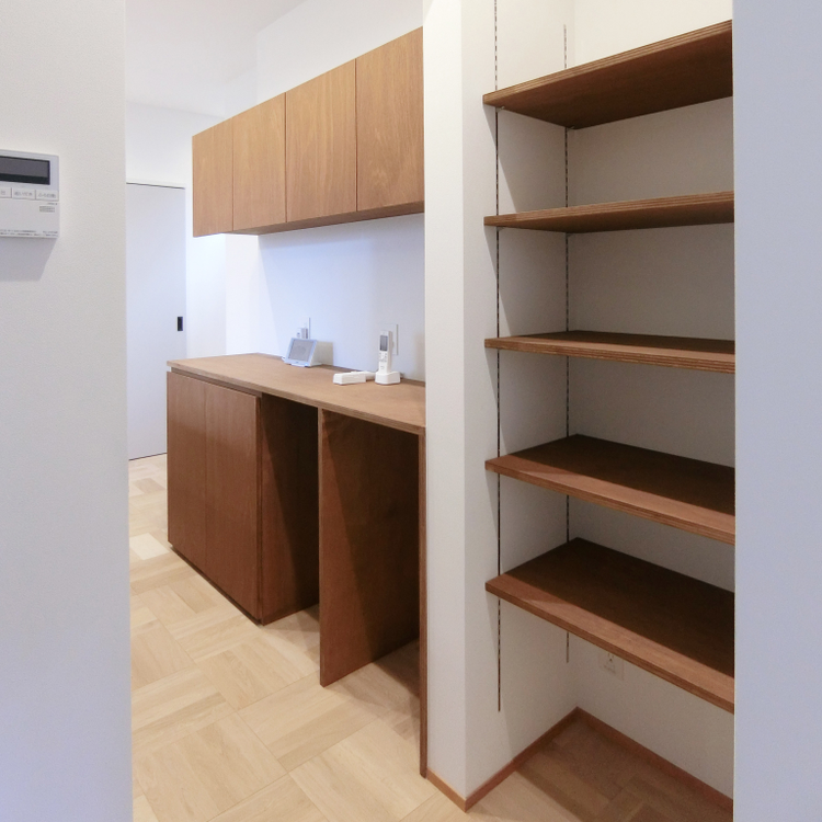 明るい木目の床と白い可動棚が特徴のパントリー。奥にはキッチンとワークスペースが繋がり、家事や作業の効率を高めます。豊富な収納力で、日々の暮らしをサポートする機能的な空間です。