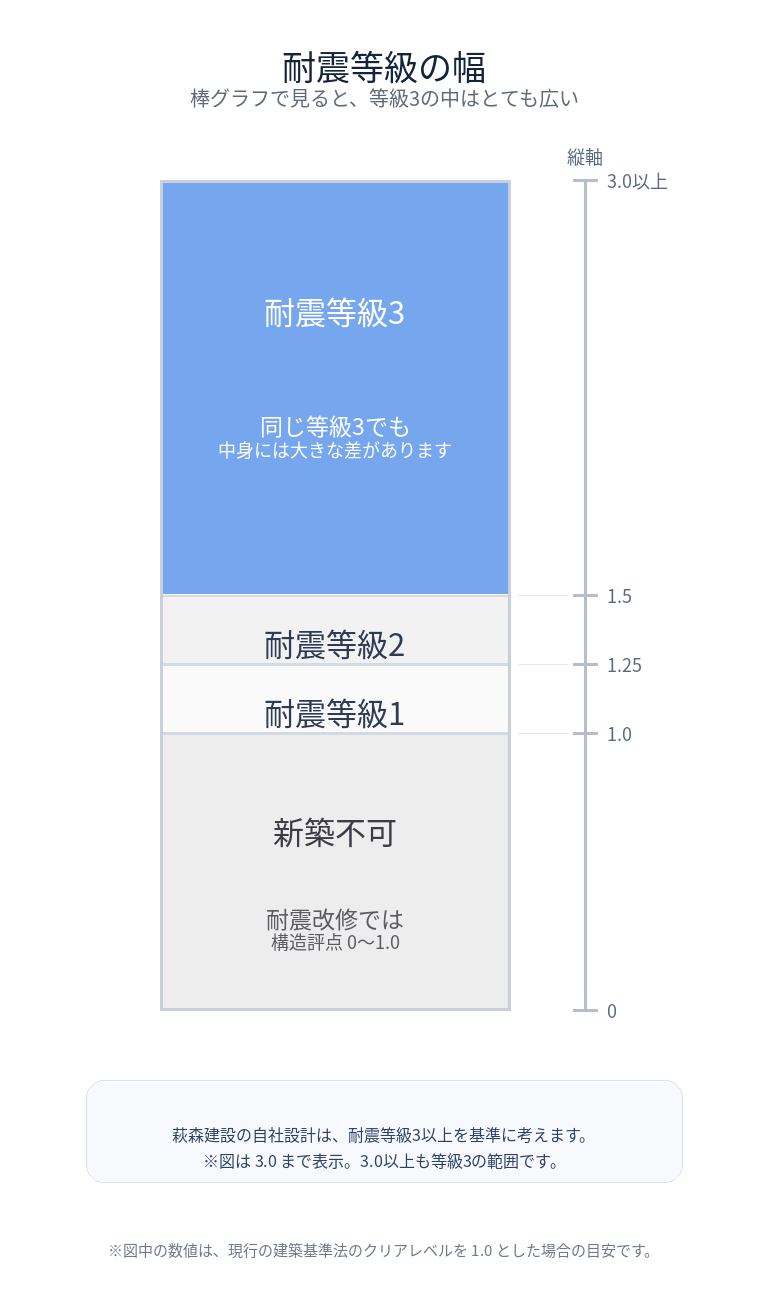 なぜかというと、耐震等級は、家の強さを細かい数字でそのまま表す仕組みではなく、確認した結果を1・2・3の3段階に分けて表す仕組みだからです。国の住宅性能表示制度でも、耐震等級は等級1・2・3で表示され、等級1は建築基準法レベル、等級2はその1.25倍、等級3は1.5倍の地震力に対する水準として整理されています。