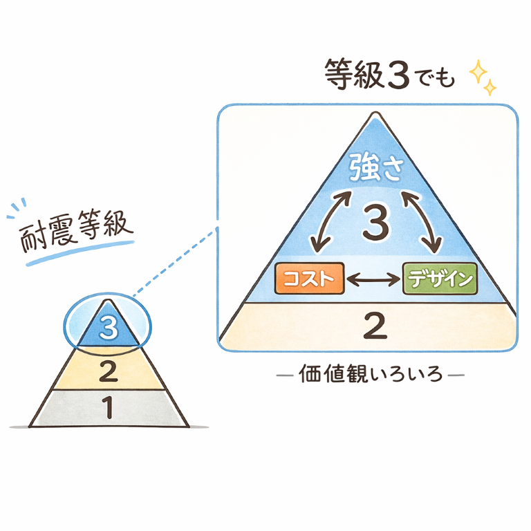 家の耐震性能は、よく「耐震等級1・2・3」で語られます。